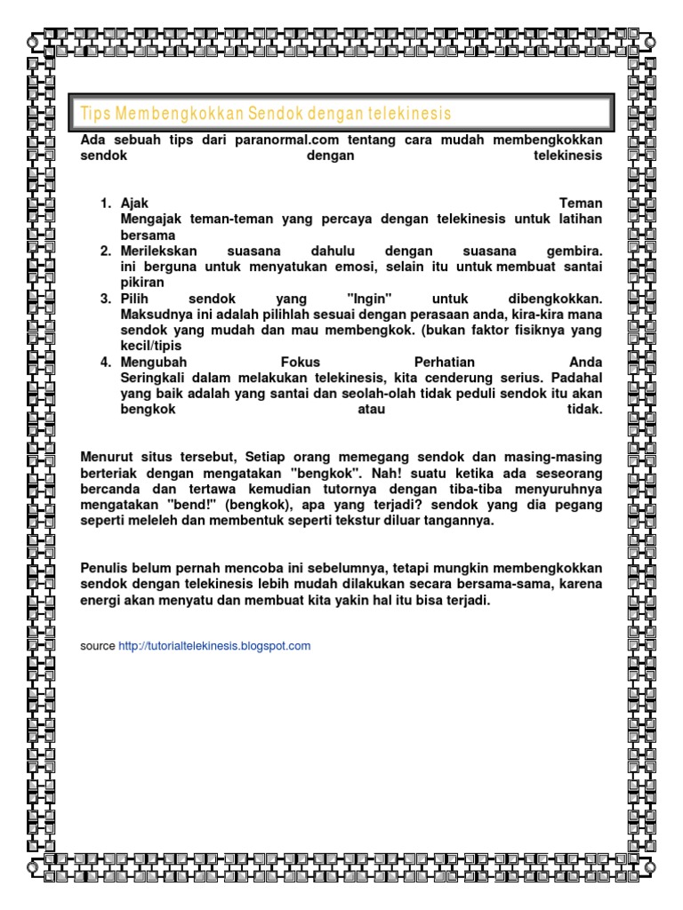 Trik ringan seperti bulu adalah cara yang seru untuk melibatkan teman dengan mengangkat mereka seakan mereka seringan bulu. Dalam hitungan detik, gagang sendok itu melengkung dengan sendirinya. Rahasia membengkokkan sendok dengan kekuatan pikiran dalam salah satu aksinya, pesulap deddy corbuzier memegang sebuah sendok di tangan. Sendok itu tidak memanas sama sekali, hanya sedikit menghangat. Tekan sendok pada meja dan biarkan jatuh ke belakang secara bersamaan. Membengkokkan sendok menggunakan sendok utuh. Inilah rahasia pesulap membengkokkan sendok yang selama ini menjadi misteri Membengkokkan sendok merupakan salah satu trik pesulap yang belakangan sering dimainkan. Bukanlah sihir dan bukan sejenis tipuan. Peganglah sendok dengan posisi kepala sendok mengarah ke bawah. Pegang gagang sendok secara vertical dan tatap dengan seksama. Lalu, saya bisa membengkokkan mulut sendok itu hanya dengan menggunakan ujung jari saya. Ternyata kemampuan bagi orang awam di anggap aneh dan hebat ini bisa dilakukan oleh siapa saja.